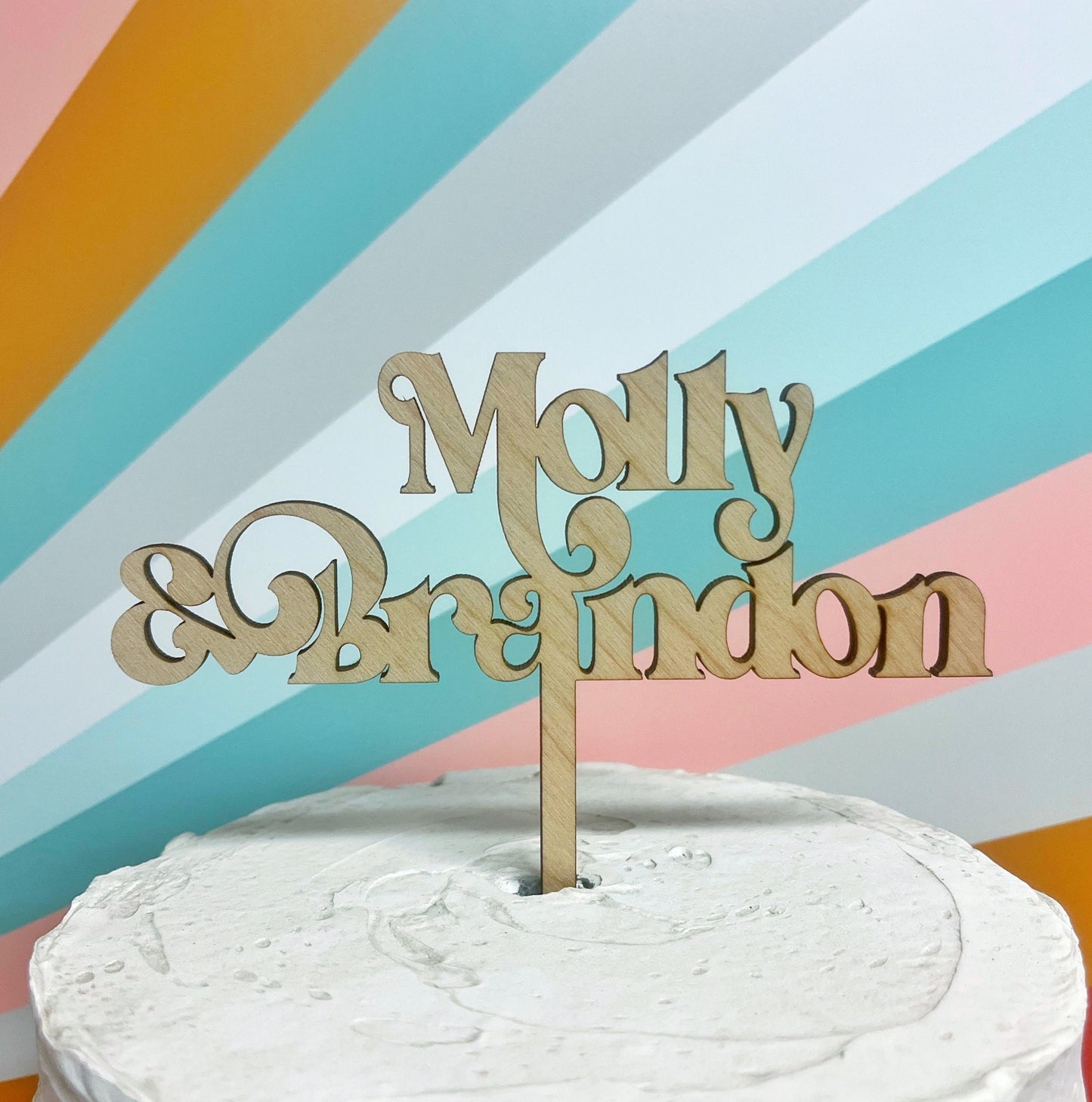 A custom wooden cake topper is a beautiful and unique decoration for any cake. This topper is laser cut from high-quality wood and crafted by skilled artisans to ensure a flawless finish. The topper can be customized with any message, name, or design of your choice, making it a personalized and meaningful addition to your special occasion.